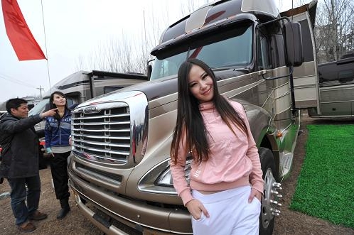 3月22日,一名車(chē)模站在第四屆北京國(guó)際房車(chē)露營(yíng)展一款大型房車(chē)前。當(dāng)日,為期4天的2012第四屆北京國(guó)際房車(chē)露營(yíng)展覽會(huì)在北京市房山區(qū)北京房車(chē)博覽中心開(kāi)幕。近200輛房車(chē),近千種各類(lèi)型房車(chē)零配件等與公眾見(jiàn)面。