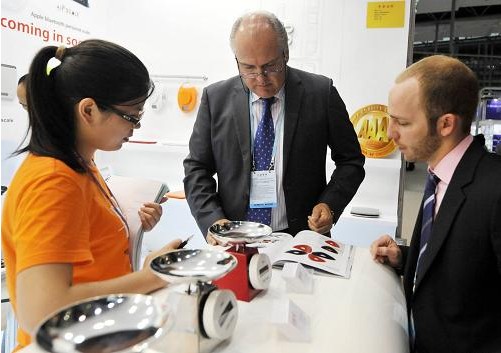 在廣交會(huì)一期上,兩位采購(gòu)商在一個(gè)電子秤展位前瀏覽產(chǎn)品介紹。為期5天的廣交會(huì)第一期于4月19日結(jié)束。受歐債危機(jī)隱憂(yōu)持續(xù)、歐元區(qū)經(jīng)濟(jì)衰退風(fēng)險(xiǎn)加劇以及新興經(jīng)濟(jì)體面臨通貨膨脹和經(jīng)濟(jì)增速回落疊加影響,本屆廣交會(huì)一期成交較上年同期和上一屆,均有一定幅度的下滑。據(jù)統(tǒng)計(jì),機(jī)電產(chǎn)品累計(jì)成交額188億美元,占全部成交額的83.9%,較上年春季廣交會(huì)同期下降5.5%,較第110屆秋交會(huì)下降9.5%。