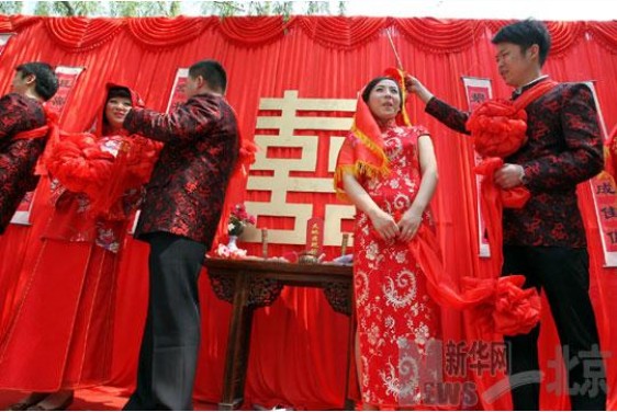 5月8日,一場按照北京民俗舉辦的中式集體婚禮在北海公園舉行,六對新人喜結(jié)良緣。此次婚禮揭開了2012西城時尚婚慶文化博覽會的“蓋頭”。作為2012北京西單國際時尚節(jié)系列主題活動之一,2012北京西城時尚婚慶文化博覽會于5月8日--13日在北海公園舉辦。(來源:新華網(wǎng))
