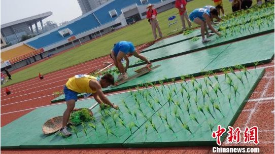 5月17日,廣西第七屆農(nóng)民運(yùn)動(dòng)會(huì)呈現(xiàn)出“農(nóng)忙”景象。當(dāng)日,插秧比賽在柳州市體育中心進(jìn)行,農(nóng)民運(yùn)動(dòng)員在比賽中不僅需要比拼耐力,還要比拼技巧和速度。(來(lái)源:中新網(wǎng))