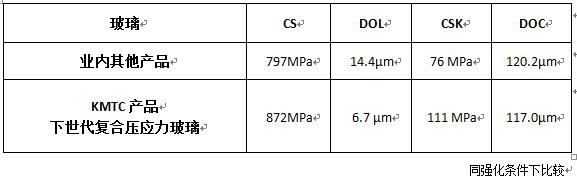 復(fù)合壓應(yīng)力玻璃為新一代鋰鋁硅玻璃,可化學(xué)強(qiáng)化(CS)值在800MPa以上,深度(DOC)高于110µm。