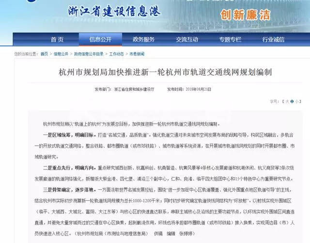 2018年8月21日,浙江省住房和城鄉(xiāng)建設廳官網(wǎng)上發(fā)布了一則和杭州軌道交通有關(guān)的信息——杭州市以“軌道上的杭州”為發(fā)展總目標,杭州市規(guī)劃局正在加快推進新一輪杭州市軌道交通線網(wǎng)規(guī)劃編制。
